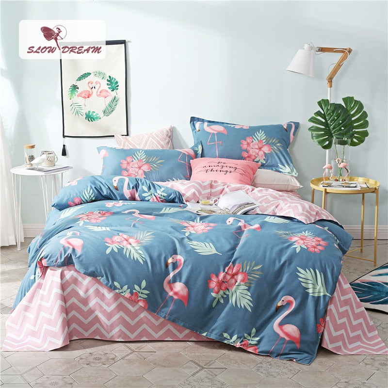 SlowDream Pink Flamingos Bedding Set Blue Euro Bedspread Luxury Duvet Cover Double Bed Sheets Linens Queen King Adult Bedclothes